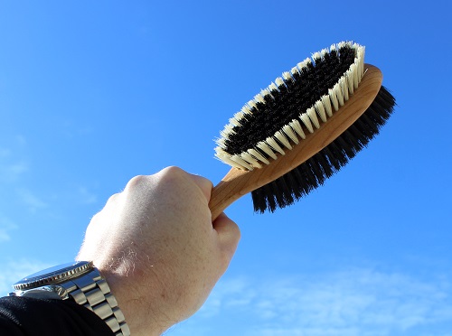 Sure, those sticky rollers are great for quick fixes or for use on more casual clothes, but for nicer stuff? Consider a clothes brush. They’re specifically designed to lift dirt and hair out and up from a suit’s fabric, without damaging the weave, and without leaving any sort of sticky residue behind. Kent makes terrific clothes brushes. Shown above is an older model of the two sided (soft/stiff) bristle brush.