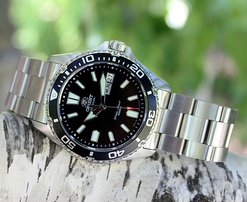 Hacks, hand winds, has a sapphire crystal, a 120 click bezel, solid end links, and the best of both the Mako and Ray worlds when it comes to the looks on the dial. A little tough to find sometimes, but is available at post time direct through Orient. 41.5mm case size is wearable by most. Full review can be found here.