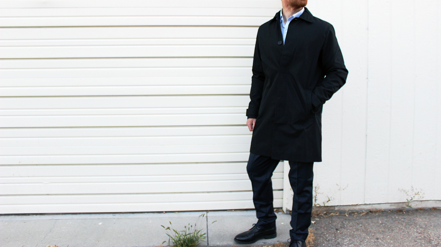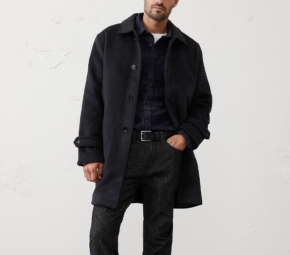 From here it looks like a winter-weight coat cut in a Mac style… not a true Mac (lighter weight/3 season) cut in a water resistant wool material that’s akin more to suiting fabrics. The latter does exist out there. And they’re spendy. They’re nice, those lighter weight wool macs. This doesn’t appear to be that though. Still. Looks good.