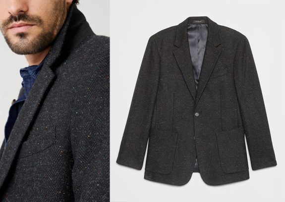Interesting thanks to the traditional donegal flecks, and still dressy thanks to the dark base color. Fabric is a mix: 55% recycled polyester, 40% recycled wool, 5% other fibers. But that’s why it’s also (well) under a hundred bucks. Probably fair to assume that this one will be like the houndstooth option straight out of the box. Meaning: less flexible than ideal. These are not the unconstructed Bonobos hopsack afterall.