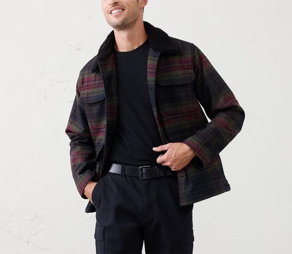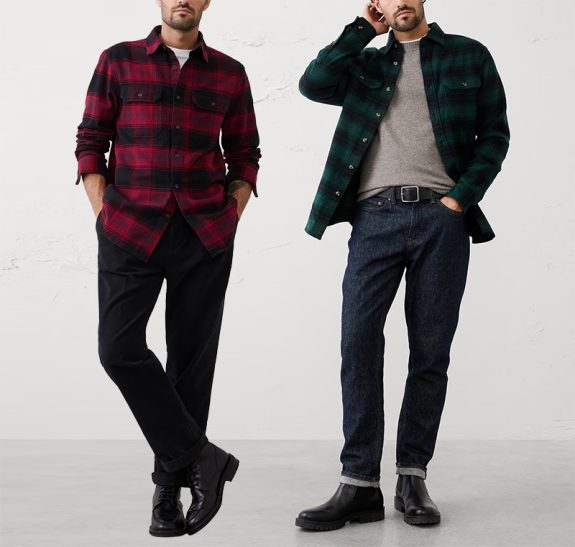 Work-shirt style double chest pockets. Various plaids. Note that some colors/patterns have become final sale, so anything tagged as such can’t be returned or exchanged. The red and green options shown above, at post time, were still returnable/exchangeable.