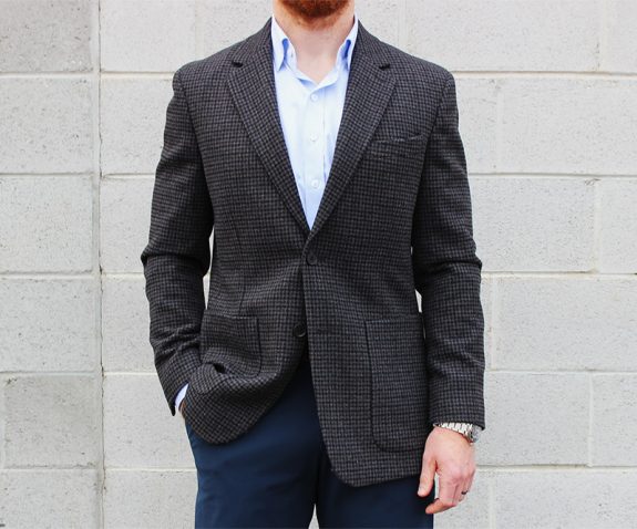 51% recycled polyester, 41% wool, 8% other fibers. Patch pockets keep it casual. Still smart, but casual enough to wear with jeans. It’s a bit on the stiff side straight out of the box. But that’s not unusual with BRF’s fall and winter sportcoats. Nor is it unusual for a cheap/cheaper sportcoat in general. Definitely a cool/colder weather weight. Houndstooth pattern is made up of gray, a darker gray (if not midnight navy) and just enough of a quiet rust brown to keep things interesting.