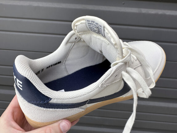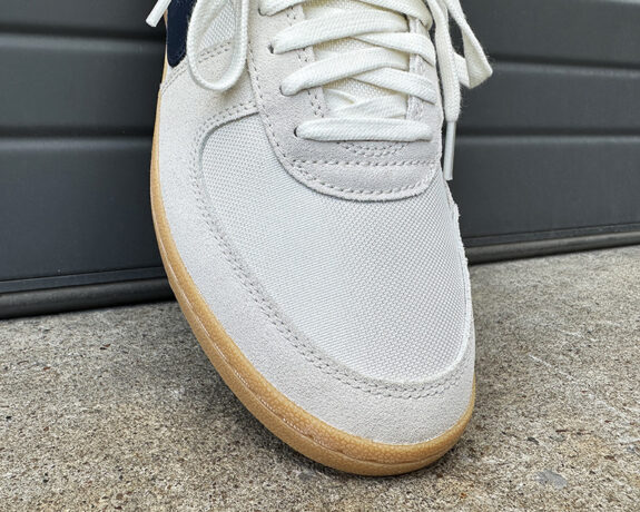 The upper’s suede panels feel soft and almost premium with a nice hand and consistent texture throughout. The woven textile sections add another layer of visual contrast while maintaining durability – the weave is tight and feels well-executed. I especially like the cool, casual navy blue leather Nike Swoosh that wraps around to meet a matching leather heel tab with the Nike font screen printed on. As mentioned, these look and feel like the Killshot 2’s cousin that made the varsity team, where the Killshot 2 sits in the bleachers. Stitching is clean and consistent, particularly around high-stress areas like the toe box and heel. The materials feel like they’ll age well rather than simply wear out, with the suede likely to develop character over time. If these shoes are going to fail, it will be at the stitched seam at the medial flex point.