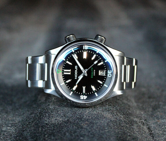 A GADA (go anywhere do anything) watch with a bit more visual spice thanks to that extra crown. Looks simultaneously interesting and subtle. 40mm diameter, 11.5mm thick. Looks great with a t-shirt and jeans, a suit, and everything in-between. Styling is inspired by compressor-case watches from the 1970s. Top crown works the inner bezel, bottom crown works the movement. Both screw down, and the entire thing feels solid and well made. It’s also assembled and regulated in the USA. Miyota 9015 automatic movement. Sapphire crystal. 300m of water resistance. The on-the-fly push-button micro-adjustment feature in the clasp is a huge bonus. As are the quick release pins on the bracelet, so swapping out said bracelet for a leather strap or NATO is quick and easy. Available with a black or white dial, and a 60 minute or 12 hour interior rotating bezel.