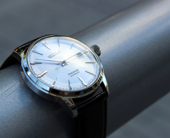 A favorite of watch aficionados, this is the one with an almost iridescent blueish-silver dial. Case size is a pleasing for many 40.5mm, and the movement hacks and hand winds. The hands and indices look razor sharp, the case back is an exhibition style showing off the 23-jewel movement, and the slightly tapered crown has a classically styled Seiko “S” etched into it. But it’s the band that’s a deal breaker for some of us. Sure it’s pliable leather with a soft underside, and the blue accent stitching is neat, but the topside is a glossy almost patent leather. It’s easy to see what they’re going for here, but it just doesn’t do the piece justice. Looks cheap. Yet a strap change-out is simple enough. Go with a black croc style embossed instead.