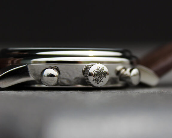 The chronograph quartz movement is intuitive and a pleasure to use. One push of the top plunger at 2 o’clock gets the stop-watch going. A second push stops it. Depress the bottom plunger and the thing resets. A 60 min sub-dial at 9 o’clock keeps track of the time elapsed.