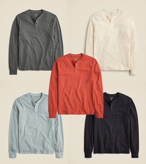 A customer favorite. Their standard weight henleys. Henleys are great, and J. Crew’s vintage-wash fabric has its fans. Not super thick or bulky. Eight colors to choose from.