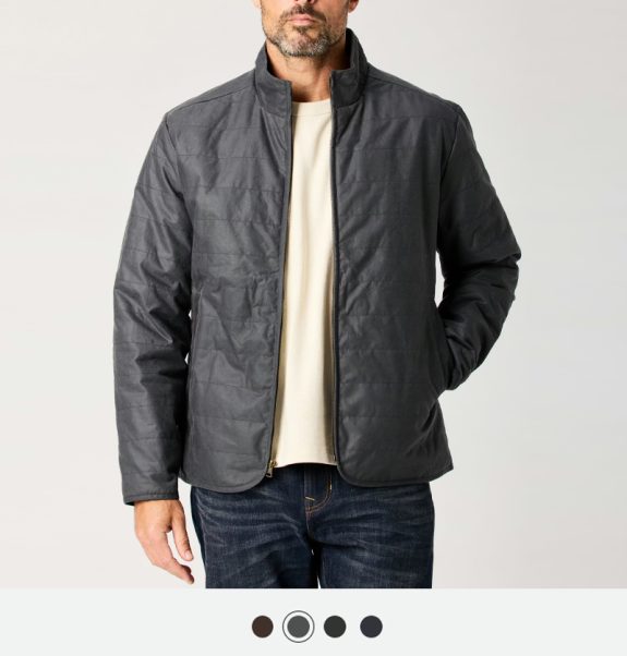 Four colors. The brilliant midpoint between a waxed jacket and a quilted jacket. Cheapest option is the gray shown above. Dark Navy, Olive, and Brown are $223.