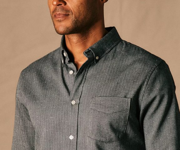 A basic button down that’s not boring, thanks to the charcoal gray herringbone + donegal fabric. Overbuilt with details like reinforced elbow patches and a bi-swing construction in the back for additional shoulder movement.