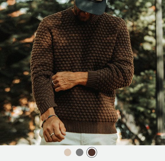 Also shown at the very top of the post in “bone.” 65% wool/35% nylon, bobble-stitch with some “oomph” to deliver all the fisherman-sweater feels. Three colors.