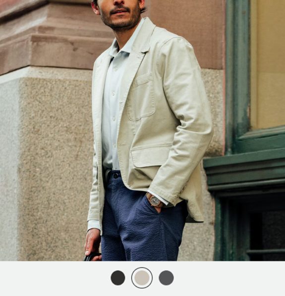 More basic than the Wellen Trap Blazers. Which is great if you’re not looking for something that straddles the line between heritage-sporting and modern sportcoat. Just want a more casual leaning, cotton (97% cotton/3% spandex) blazer? Then this one is worth a shot. Unlined back. Patch pockets. 50% off helps too. Reviews seem to indicated it might have some wonk to the fit, but taking it to a tailor may solve that.