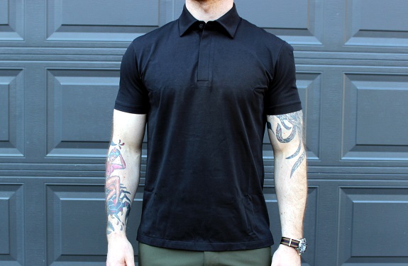 Size shown is a large on Jason who is 5’7″/175. Proof built this bad boy with merino wool, but in an “89%”wool, 11% nylon” blend. The nylon aides in creating a cool, smooth fabric that Proof claims can go 72 hours of wear with no stink. The shirt drapes well, and offers plenty of room for mobility without being boxy. Spendy at $88, but Proof made this one to move and do-it-all over the course of not just one day, but a few. Hence, the “72 hours” name. So some of us would rationalize the splurge as it really being three (days worth of) polo shirt(s) in one? While this isn’t as aesthetically polished as say, the SuitSupply polos or a Banana Republic luxe touch polo, it fills a very simple yet valuable need – a shirt that looks good and stays out of your mind all day long. No fuss.