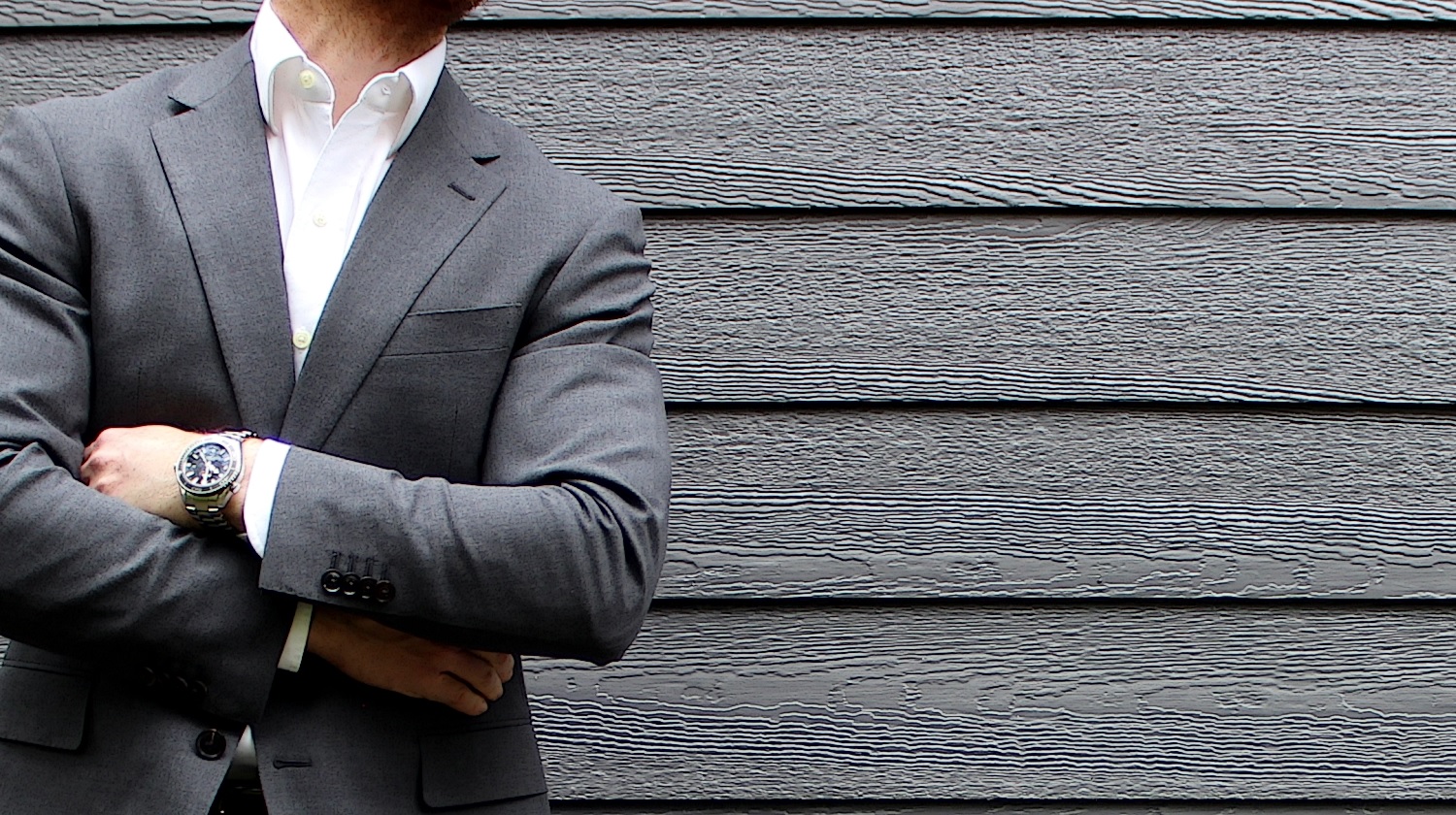 PROS: Sold as separates so you’re not stuck with a “nested” jacket and pants. You pick the size of the jacket, you pick the size of the pants, bang there’s your suit. All season wool from Italy’s Reda mill. Softer shoulder and sleeves designed for ease of movement. Suit, overall, moves super well with just a hint of natural stretch. Very subtle “nailhead” visual texture makes it interesting but still all-occasions appropriate. Also available in a deep blue option. Would excel in all three scenarios from our “Versatile Medium Gray Suit – 3 Ways“ posts. Size shown above is a 36R jacket and 31 trouser on Ryan who is 5’9″/160.