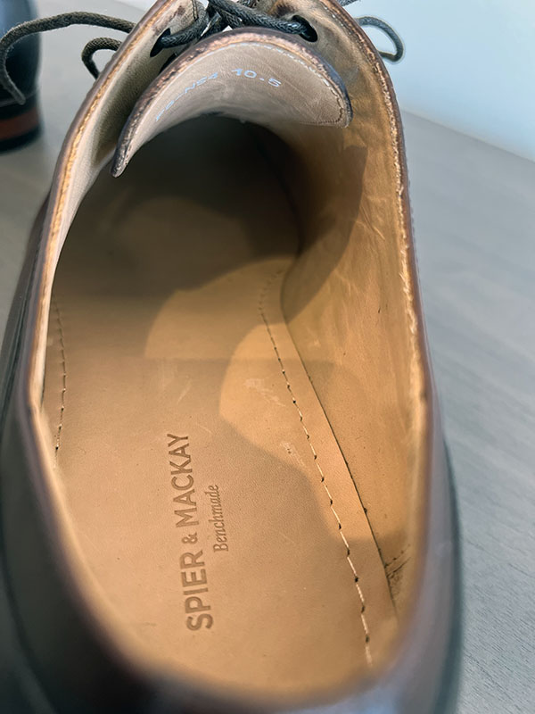 Fresh out of the box, I’m very intrigued by the softness of the leather upper. Inexpensive shoes, like those commonly found in big box mall retailers, typically feature leather that is hard and highly polished. While that might sound ideal, the leather tends to be a lower quality hide that has been heavily corrected – the tannery sands away any imperfections and follows that up with a heavy coat of pigmented chemical dye – in an effort to salvage a less than ideal slab of leather. That finishing layer of colored “drywall spackle” binds to the leather and evens out the surface grain, but tends to be a failure point. Over time, heavily corrected grain tends to crack or flake off. If you’ve ever had a cheap piece of “bonded leather” furniture, you’ve seen this happen over time. These Spier & Mackay cap toes are nothing like that. The leather is soft and supple, reminding me somewhat of a well-loved baseball glove. Spier says this leather is full-grain calfskin and it was sourced from a European tannery. I believe them; it feels great for the price.