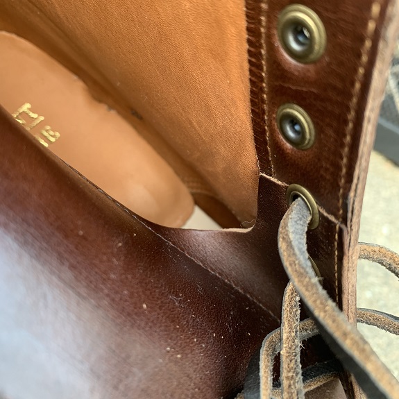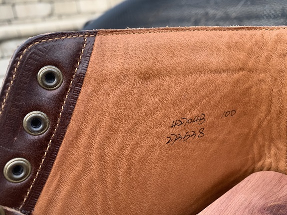Looking inside, you’ll notice the full grain bovine lining and vegetable tanned leather insoles. The embossed leather heel pad has a layer of foam cushioning underneath for instant comfort, but the cork filling and steel shank underneath those veg tan leather insoles will take a few wears to properly break in and mold to your feet. One interesting note is that the tongue is slightly gusseted at the bottom, which is something usually only seen on work boots or hiking boots where you’re worried about water entering. Also neat is the handwritten model and size info at the ankle. It’s a small touch, but I dig it.