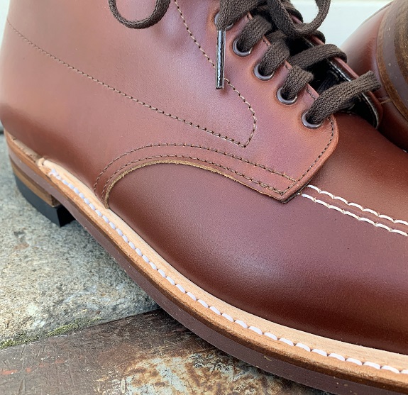 After taking the boots out of the box and unbagging them, the first thing that strikes you is the warm brick red color of this leather. It’s sometimes hard to determine color accuracy online – different monitors and cameras will display colors differently – but this is certainly a darker shade of red in between a mahogany brown and a burgundy. It’s quite striking, but not in a “What the hell am I going to wear these with?” kind of way. The natural leather storm welt, white welt stitching, and white moc toe stitching add a nice pop of contrasting color that compliments the matte full-grain cowhide leather upper, sourced from Chicago’s Horween tannery. According to an internet friend of mine that works for Alden, this particular leather tannage is called Legacy, a variant of Latigo and similar to the infamous and widely used Chromexcel. Brown eyelets, speed hooks, and flat cotton laces round out the package up top.