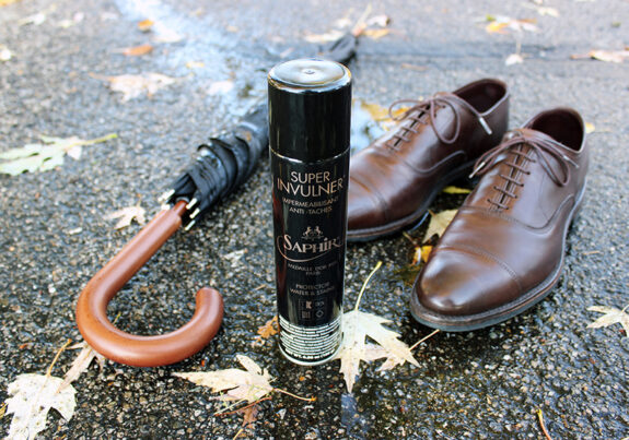 High quality spray on products like Saphir’s Invulner use resin to create a waterproof layer on top but still allows for the leather to breathe. This is ideal for calfskin, suede, and other high quality or dressy leather shoes (as shown above on a pair of Dappered Editor Joe’s well loved Allen Edmonds Park Avenue Oxfords). For fabric sneakers and rain boots (like L.L. Bean boots), I use Tarrago’s Nano Protector because it includes a hint of silicone in the formula to help repel water. For hikers and hunters who need the ultimate protection against the elements, Saphir’s Everest dubbin grease is great for waterproofing your boots but please note that it may darken the color. And if you’re really heading out there, make sure your boots have the proper insulation and breathable yet waterproof lining (gore-tex). Wet feet = dangerous when it comes to spending real time outdoors.